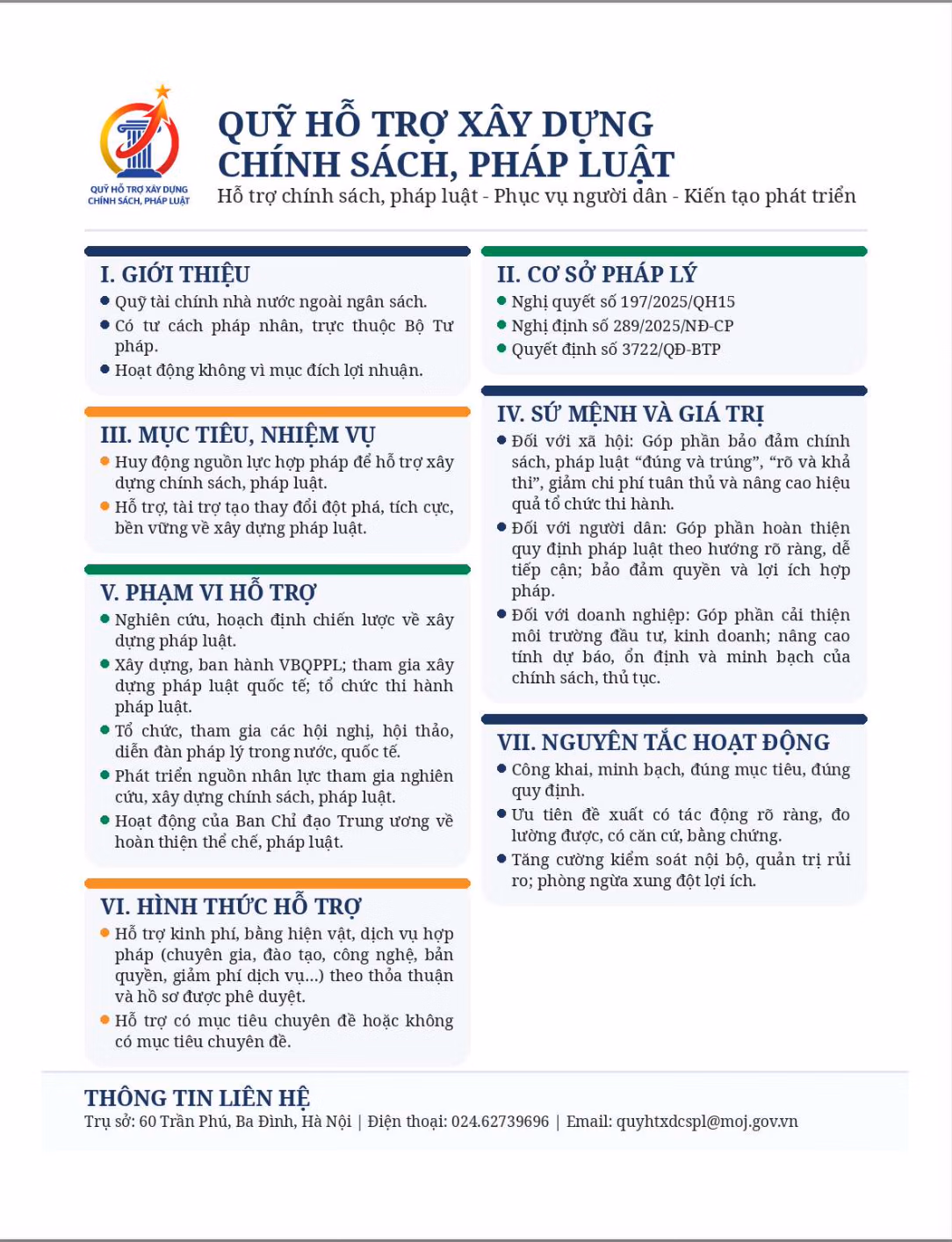 Quỹ hỗ trợ xây dựng chính sách, pháp luật là thiết chế hỗ trợ có ý nghĩa ở tầm quốc gia, được thành lập nhằm góp phần tạo thêm nguồn lực cho các nhiệm vụ, hoạt động quan trọng trong nghiên cứu chiến lược, nghiên cứu chính sách, xây dựng và hoàn thiện pháp luật, tổ chức thi hành pháp luật, phát triển nguồn nhân lực và huy động trí tuệ chuyên gia, nhà khoa học, nhà quản lý, cộng đồng doanh nghiệp và các chủ thể liên quan tham gia vào quá trình hoàn thiện thể chế. Với định hướng “Kết nối nguồn lực, hoàn thiện thể chế, kiến tạo tương lai”, Quỹ hướng tới trở thành cầu nối tin cậy giữa Nhà nước và xã hội trong việc huy động, tiếp nhận và phân bổ nguồn lực hợp pháp, minh bạch, hiệu quả cho công tác xây dựng chính sách, pháp luật.