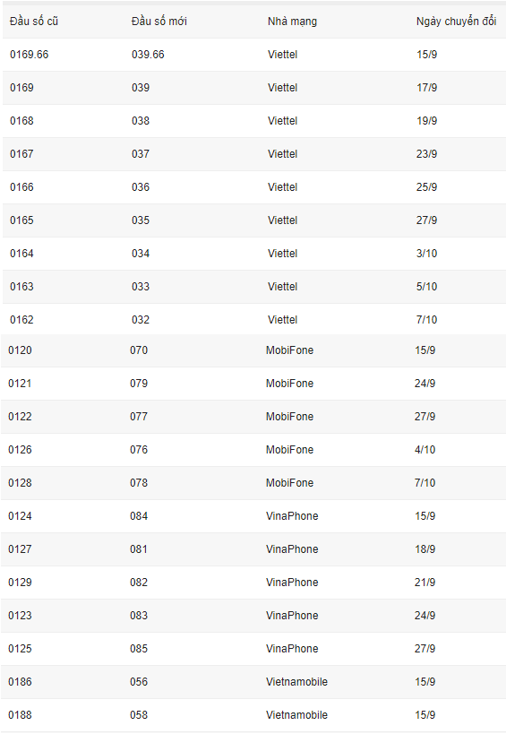 Về lộ trình chuyển đổi, nhà mạng Viettel, sẽ áp dụng bắt đầu với đầu số 0169 vào rạng sáng 15/9 và 17/9. Kế tiếp lần lượt sẽ là các đầu số 0168, 0167, 0166, 0165, 0164, 0163, 0162. Quá trình chuyển đổi của SIM 11 Viettel kết thúc vào ngày 7/10.