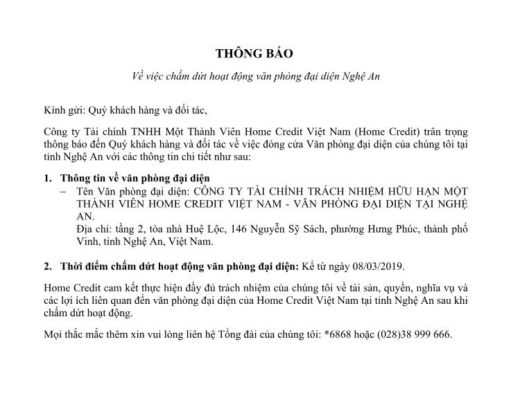 Home Credit Việt Nam chấm dứt hoạt động văn phòng đại diện Nghệ An (PLVN) - Công ty Tài chính TNHH Một Thành Viên Home Credit Việt Nam (Home Credit) vừa có thông báo về việc chấm dứt hoạt động văn phòng đại diện Nghệ An Thứ Sáu 01/03/2019 16:02 (GMT+7)