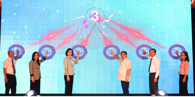 Đại biểu bấm nút khai mạc Tuần lễ công nghệ số và Hội chợ thương mại, ẩm thực, hàng tiêu dùng. |