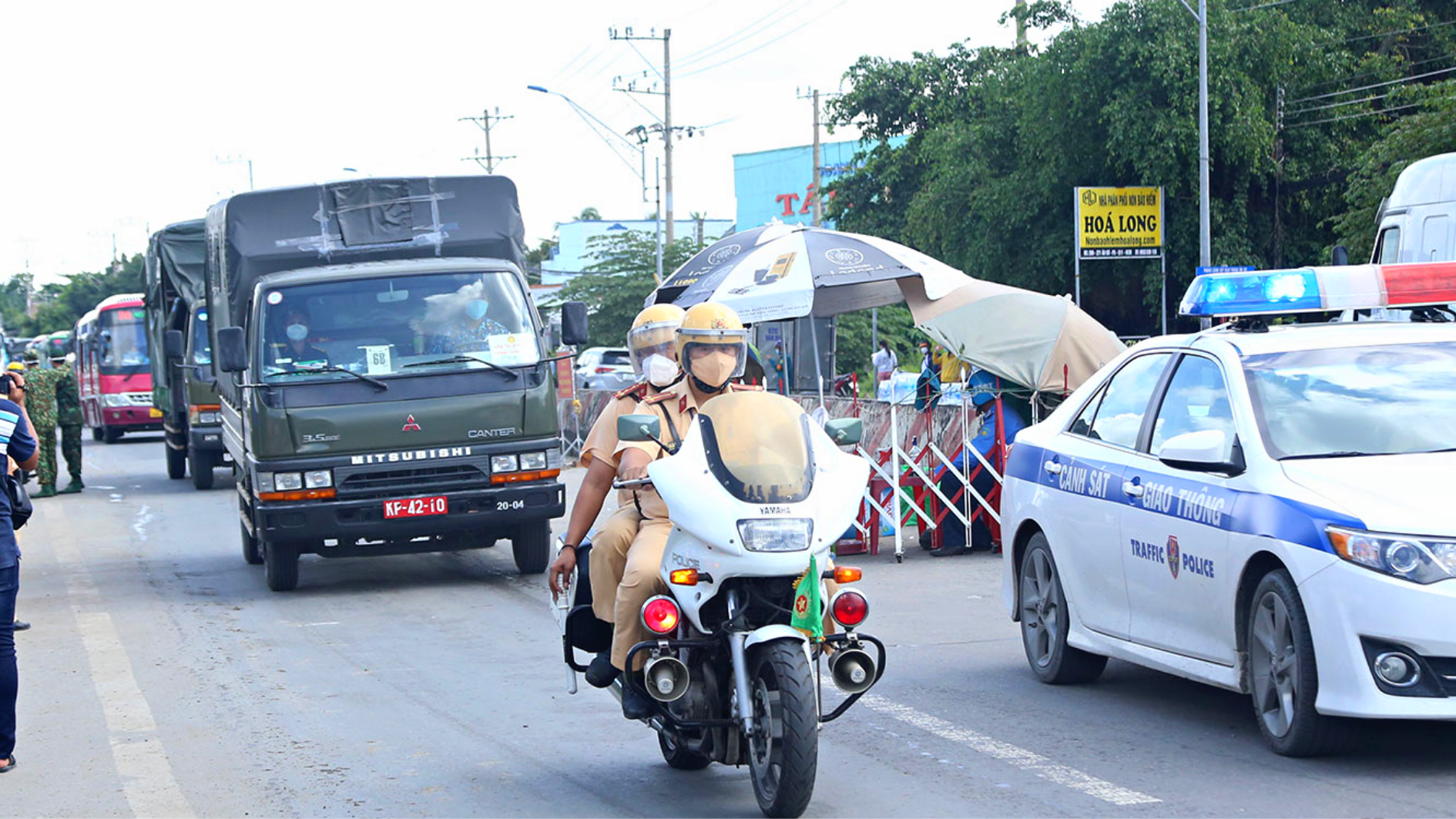 Cảnh sát giao thông Tiền Giang trung chuyển từng đoàn người về các tỉnh miền Tây. Ảnh: Hoàng Long |