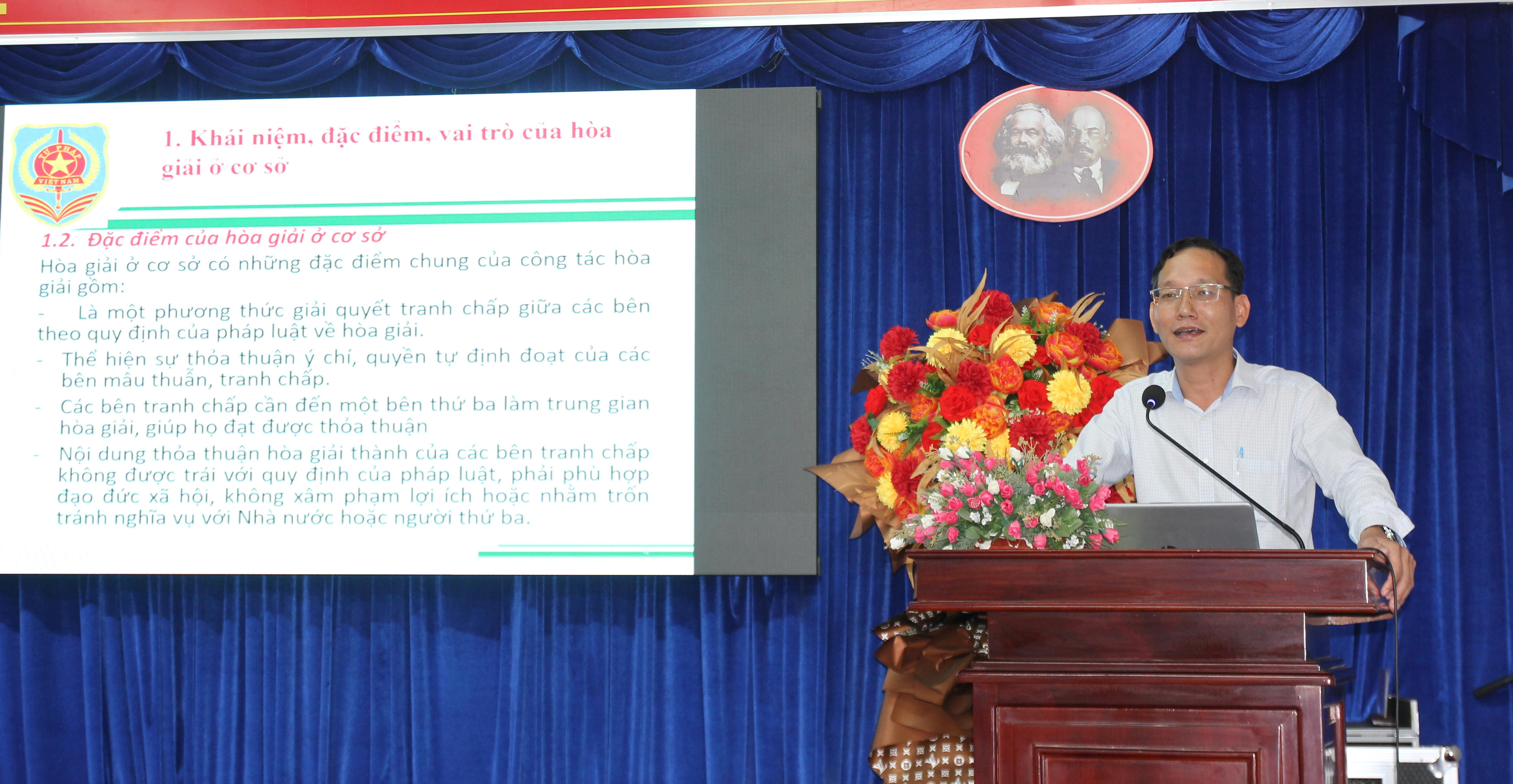 Báo cáo viên Đỗ Hồng Quang - Trưởng phòng phổ biến, giáo dục pháp luật (Sở Tư pháp Bạc Liêu) truyền đạt các Chuyên đề cơ bản của pháp luật về hòa giải ở cơ sở... |