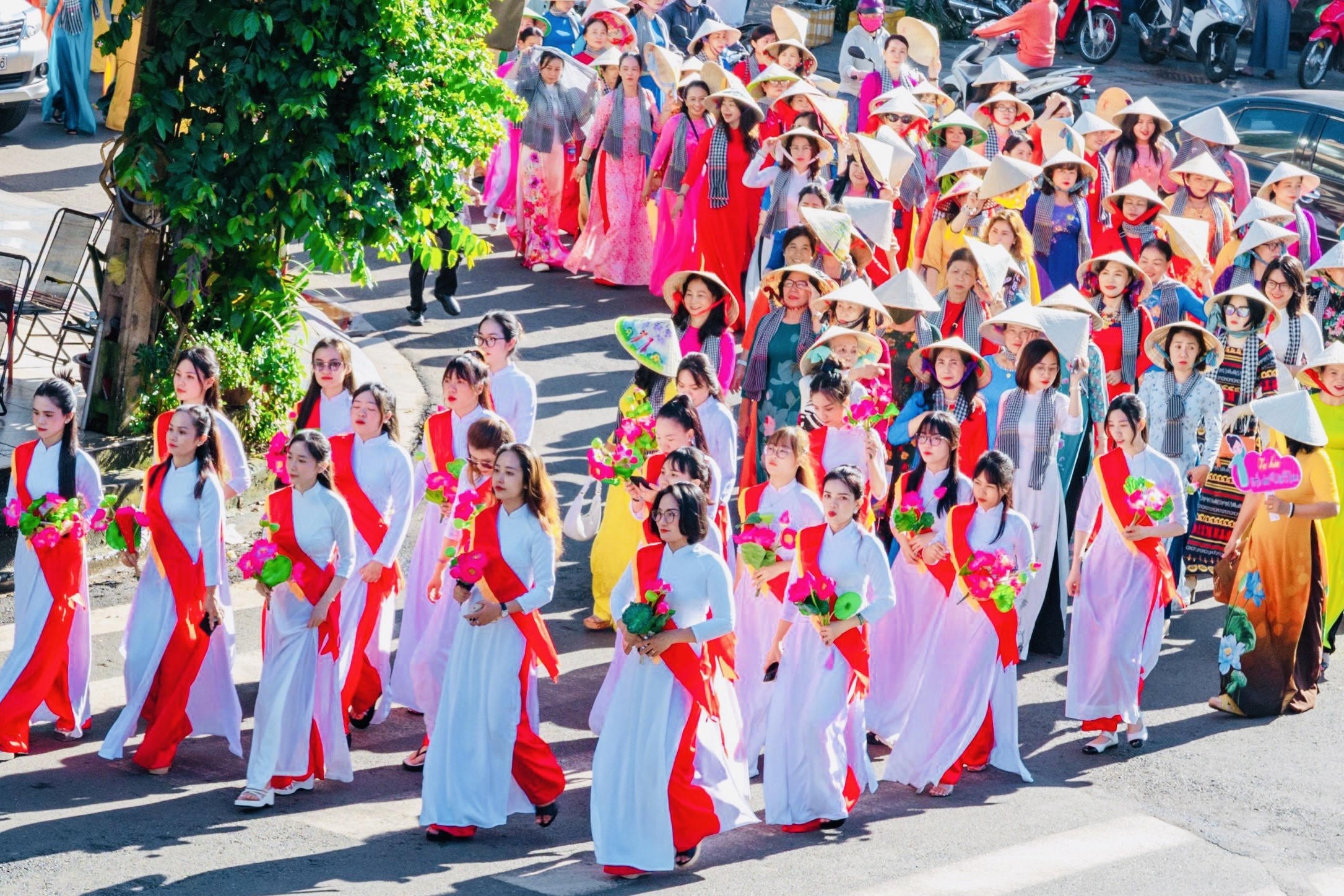 Buổi diễu hành có sự tham gia của hơn 1.500 người mặc áo dài truyền thống, đội nón lá và khăn rằn đi trên các tuyến đường TP Long Khánh.