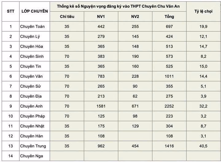 Tâm điểm trong kỳ tuyển sinh năm nay của trường THPT chuyên Chu Văn An là lớp chuyên Anh với con số áp đảo về lượng thí sinh đăng ký dự thi. Khối lớp này tiếp nhận tới 2.252 nguyện vọng trong khi chỉ tiêu chỉ có 70 học sinh cho hai lớp chuyên.