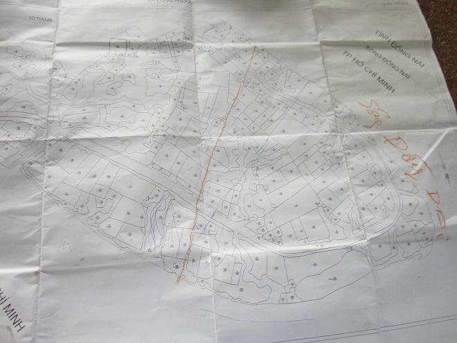 Đang trong cuộc trò chuyện, anh Hải (con trai ông Phó – PV) lấy từ trong nhà ra một tấm bản đồ rồi cẩn thận trải lên chiếc bàn gỗ tròn. Anh chỉ tay vào khu vực được đánh dấu đỏ bằng bút chì sáp, cho hay đây là tờ bản đồ 21 thể hiện diện tích đất canh tác của tổ 32 (thuộc khu phố Trường Khánh – PV). Năm 2013, phường Long Phước thống kê khu phố Trường Khánh đã bị “bốc hơi” khoảng 24 ha đất, đến nay con số này đã lên đến 60 ha.