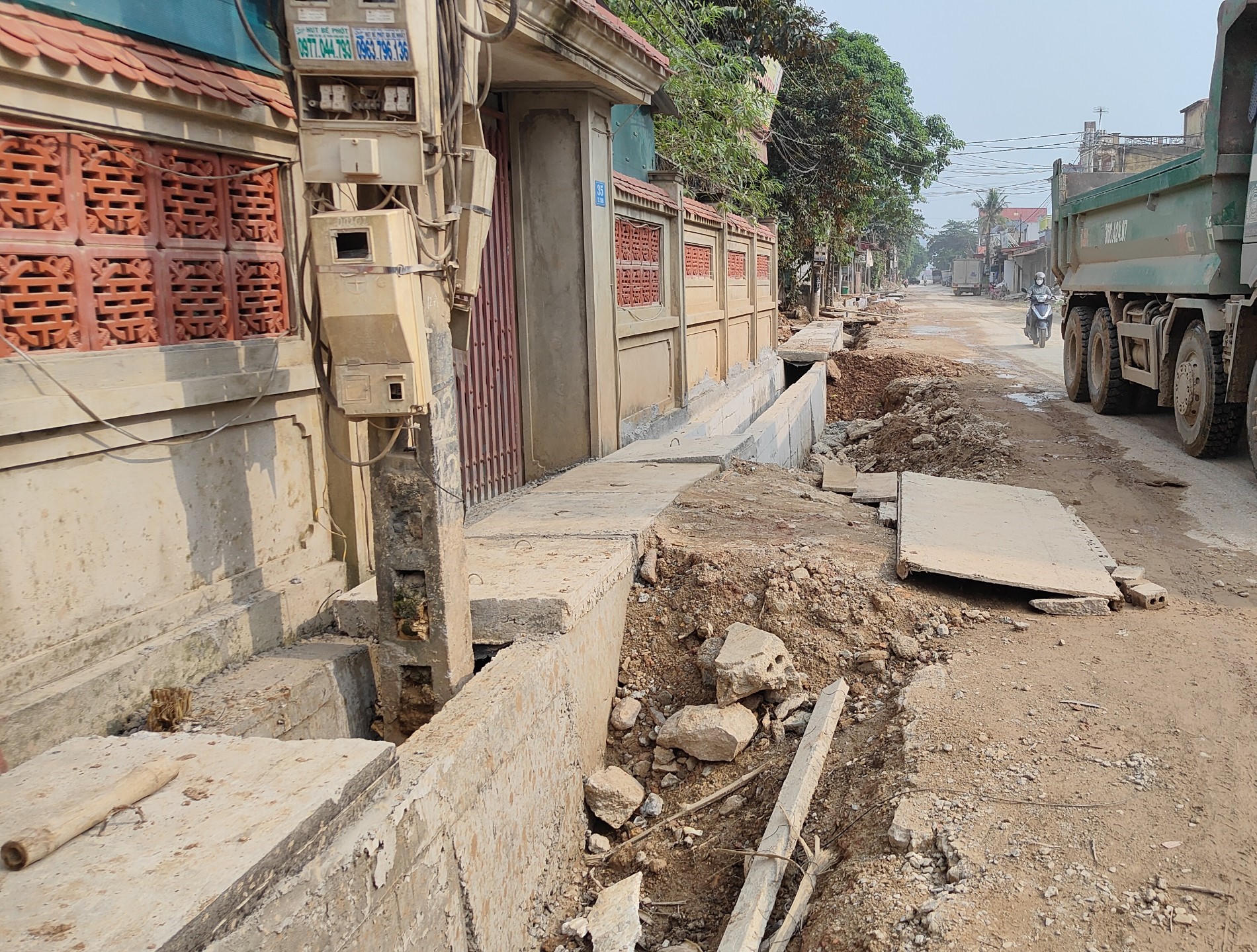Theo người dân sống ven con đường này, khi Nhà nước có dự án sửa chữa, nâng cấp tuyến đường, người dân trong thôn rất hưởng ứng, tự nguyện chặt bỏ cây, tháo dỡ các công trình trong diện phải giải phóng mặt bằng để phục vụ thi công. Tuy nhiên, không hiểu vì lý do gì những cây cột điện này vẫn chưa được di dời, nằm kẹt giữa rãnh thoát nước.