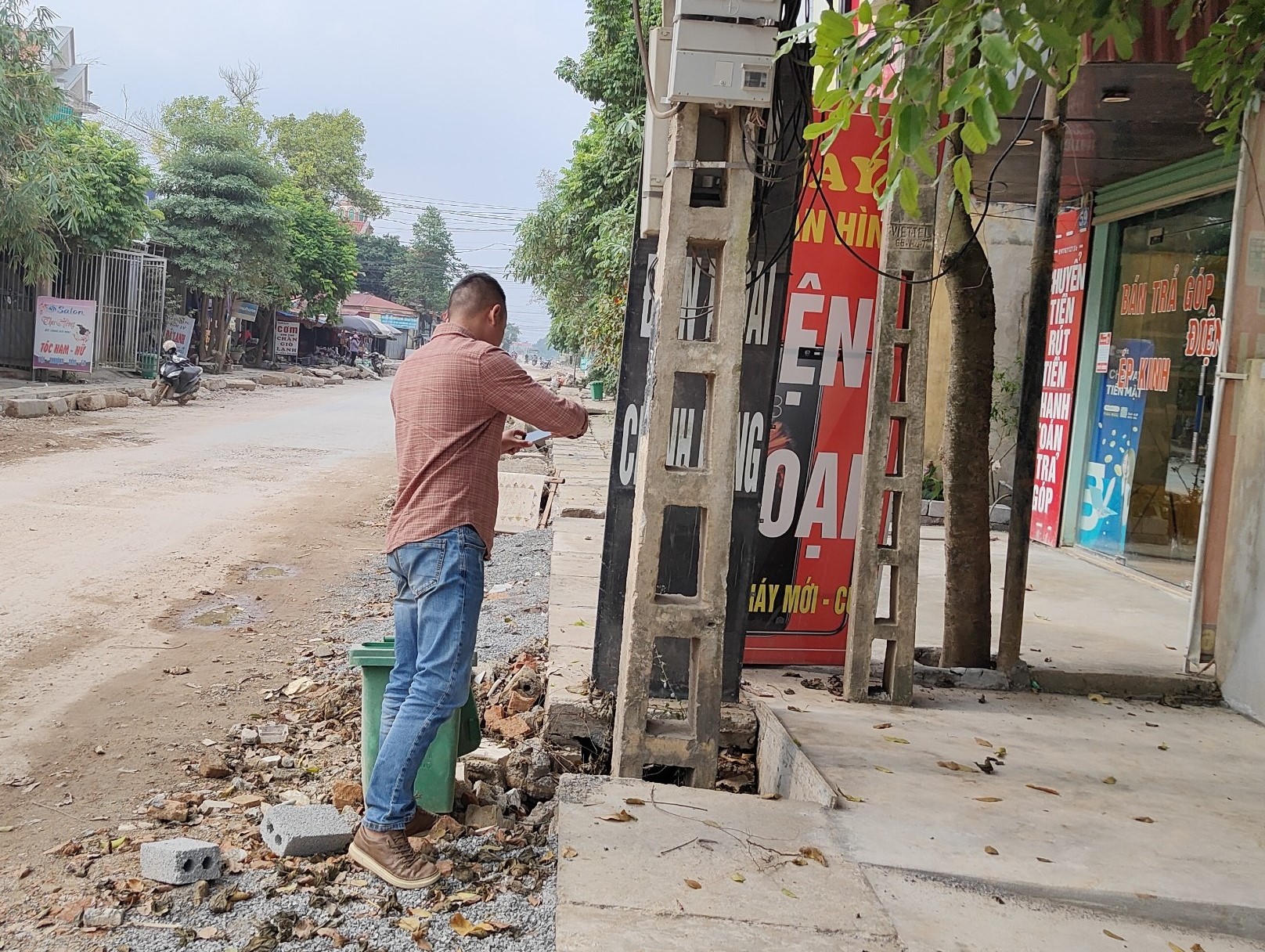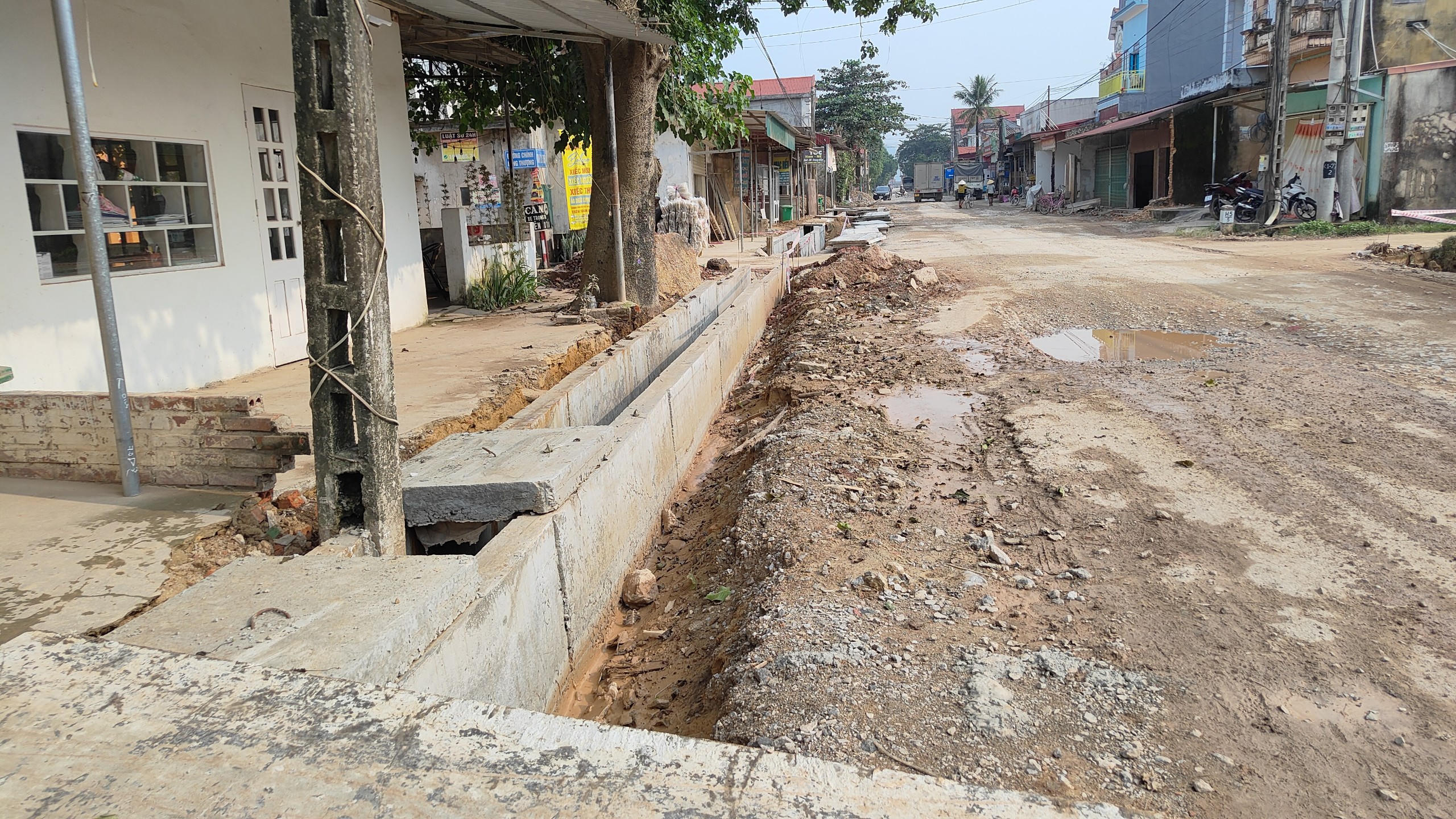Rãnh thoát nước đã được thi công nhưng cột điện vẫn mắc kẹt ở giữa. |