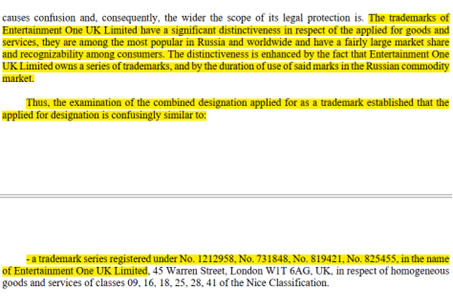 Trái ngược với tuyên bố của SConnect, Tòa án Nga không hề đưa ra bất kỳ kết luận nào về hành vi xâm phạm. Do chiến lược tố tụng quốc tế của mình, eOne đã tự nguyện rút đơn kiện tại Nga. Trên thực tế, tại Nga, SConnect đã nộp đơn đăng ký nhãn hiệu hình ảnh sói Wolfoo vào năm 2022. Tuy nhiên, vào cuối năm 2022, Tổng cục Sở hữu trí tuệ Liên bang Nga (ROSPATENT) đã quyết định từ chối đơn đăng ký nhãn hiệu của SConnect dựa trên kết luận rằng hình ảnh sói Wolfoo “tương tự gây nhầm lẫn” với nhãn hiệu Peppa Pig của eOne. Trong quyết định từ chối, ROSPATENT cũng nêu rõ: “Các nhãn hiệu của Entertainment One UK Limited có khả năng phân biệt đáng kể đối với các hàng hóa và dịch vụ được đăng ký, chúng nằm trong số các nhãn hiệu được biết đến nhiều nhất nước Nga và trên thế giới và có thị phần lớn và khả năng nhận biết cao đối với người tiêu dùng…” Thông tin này đã được báo chí quốc tế đăng tải rộng rãi, ví dụ trên chuyên trang về sở hữu trí tuệ Managing IP (Exclusive: Rospatent backs Peppa Pig in win for Western brands | Managing Intellectual Property (managingip.com)