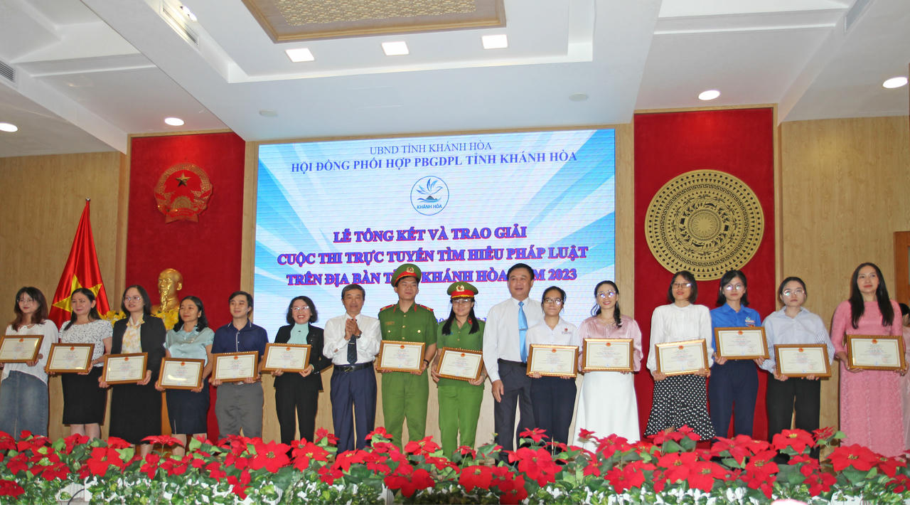 (PLVN) - Ngày 9/12, Hội đồng Phối hợp phổ biến, giáo dục pháp luật (PBGDPL) tỉnh Khánh Hòa tổ chức Lễ tổng kết và trao giải Cuộc thi trực tuyến Tìm hiểu pháp luật trên địa bàn tỉnh Khánh Hòa năm 2023.