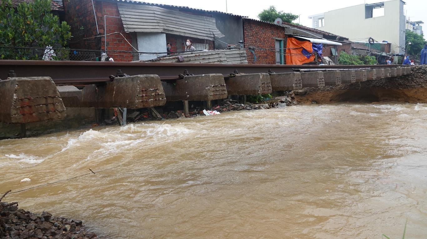 Trước đó, tối ngày 23/10, nước lũ đã cuốn trôi hoàn toàn một nền đường sắt dài khoảng 20 mét, nền đường ray cũng đang bị lũ gây xói lở, hở hàm ếch sâu vào bên trong.