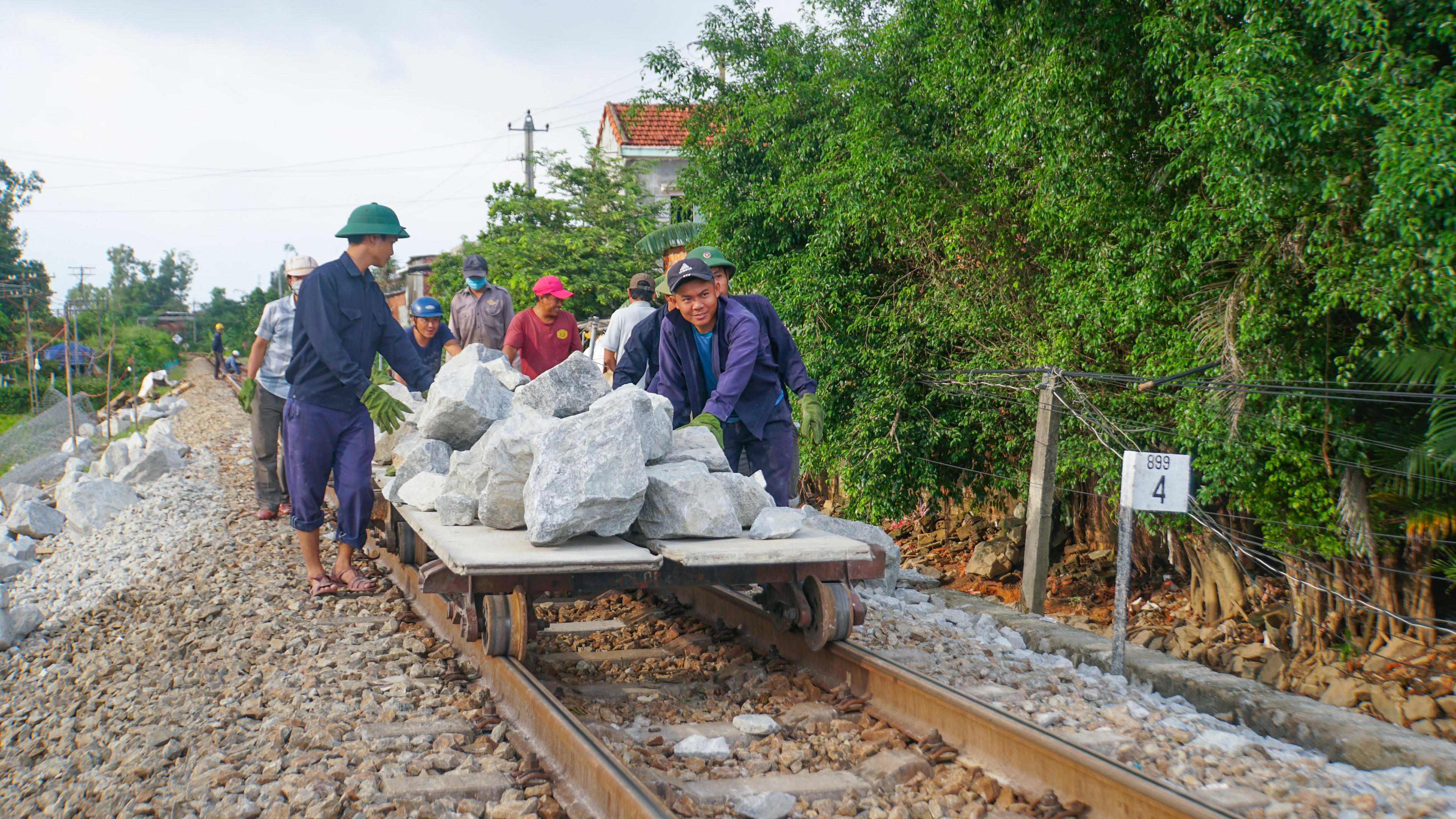 Hơn 50 công nhân ngày đêm khắc phục đường ray xe lửa bị lũ gây xói lở