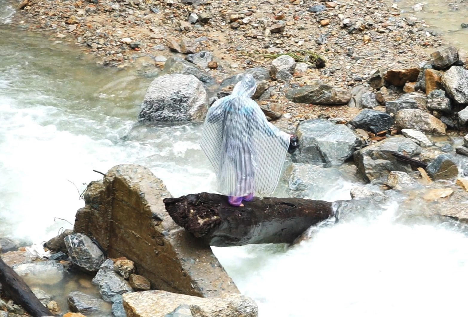 Để ra vào làng Ông Lục, nhiều người dân phải liều mình đi trên những khúc gỗ cũ để băng qua dòng nước lũ, hoặc nhảy trên các tảng đá lớn, rất nguy hiểm.