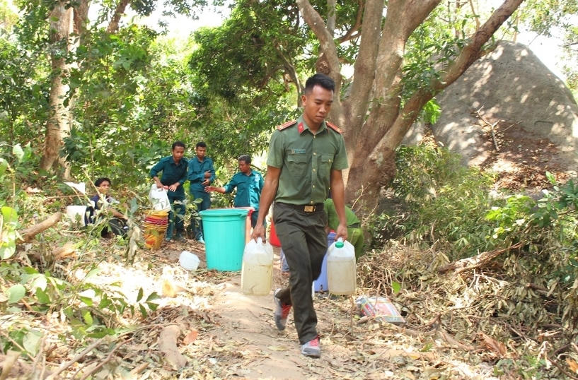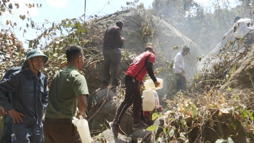 Ở những đoạn dốc đứng, đường nước không đến được, cán bộ, chiến sĩ của các lực lượng phải thay nhau xách từng can nước lên núi để tiếp viện kịp thời cho các bình phun xịt nhằm khống chế và ngăn chặn cháy lan.