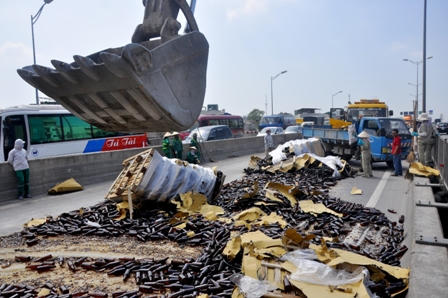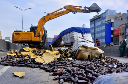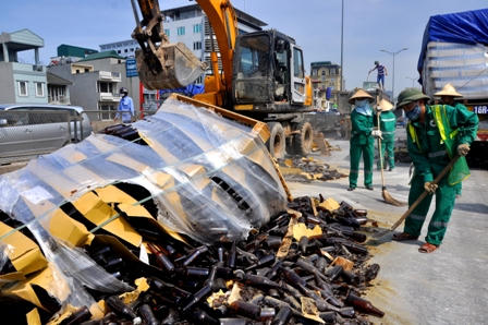| Việc khắc phục sự việc diễn ra trong nhiều giờ đồng hồ, hàng nghìn vỏ chai bia bị vỡ, khiến đường Vành đai 3 trên cao theo hướng về Mai Dịch bị phủ một lớp thủy tinh dày. |
