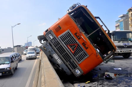 | Chiếc xe container “leo” lên lan can đường vành đai trên cao (cao khoảng hơn 60cm) rồi đổ nghiêng ra lòng đường làm các thùng vỏ chai bia bị đổ xuống đường. |