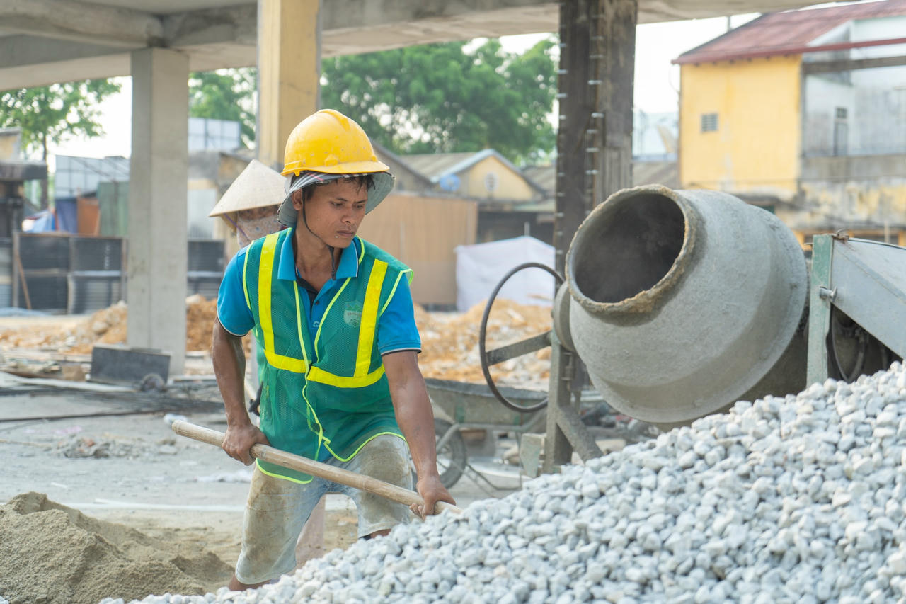 Dưới cái nắng gay gắt hơn 40 độ của tiết trời miền Trung, trên công trường xây dựng chợ tạm Khe Tre, các công nhân và máy móc vẫn hoạt động liên tục. |