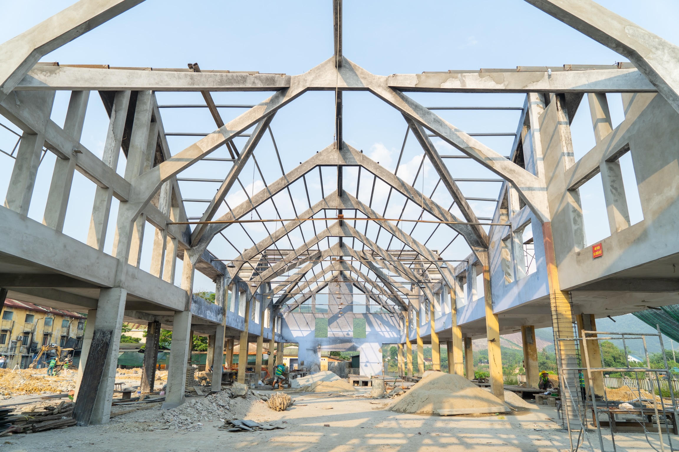 Đơn vị thi công đẩy nhanh tiến độ, sớm hoàn thành công trình xây dựng chợ tạm thị trấn Khe Tre. |