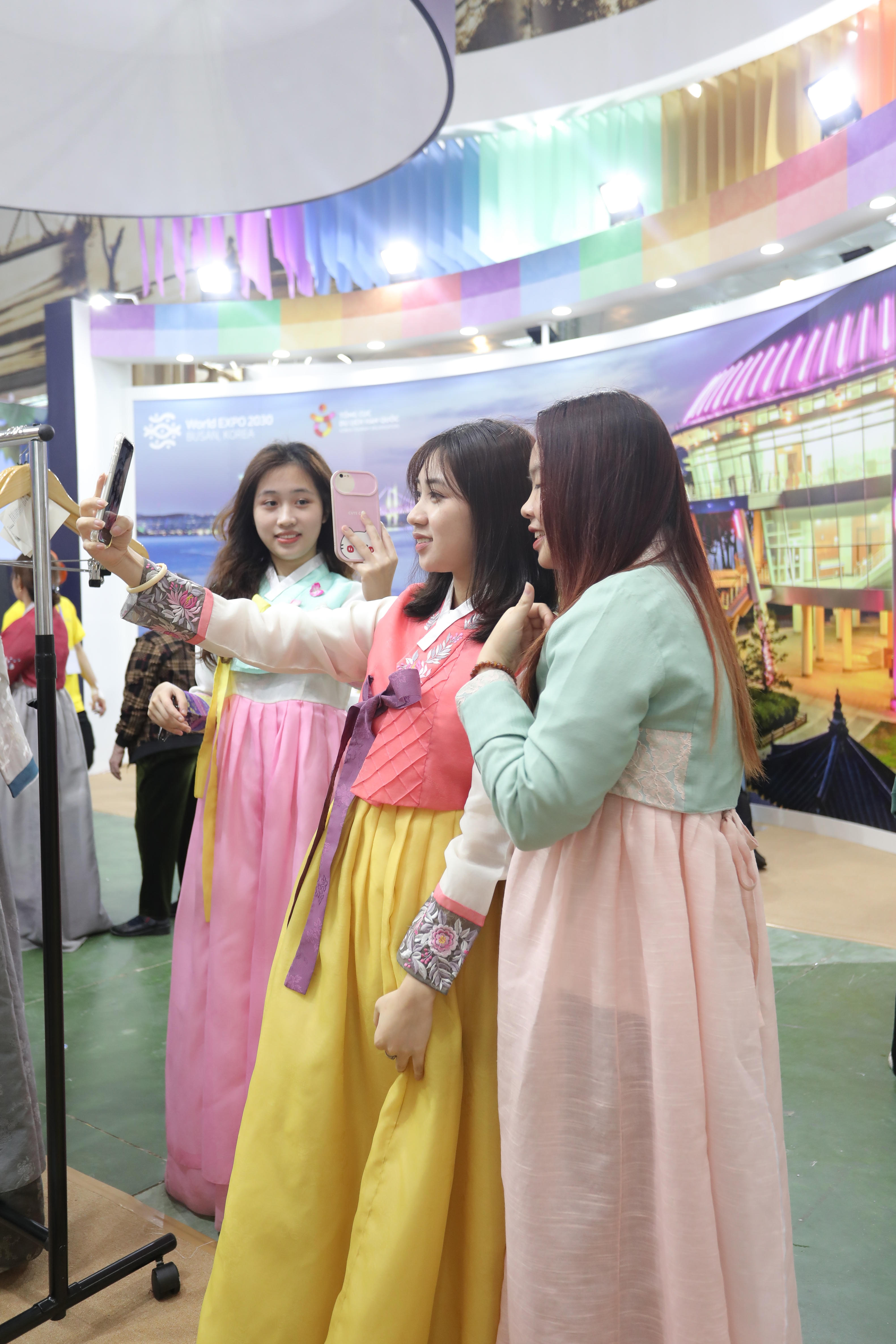 Các bạn trẻ trải nghiệm vối trang phục Hanbok của Hàn Quốc (ảnh Hà Mini). |