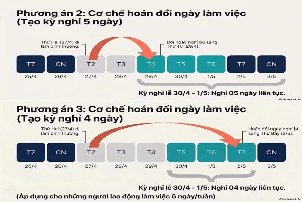 Với khoảng cách giữa hai kỳ nghỉ chỉ 2 ngày làm việc, nhiều ý kiến đề xuất xem xét hoán đổi lịch làm việc để người lao động có thể nghỉ liên tục tới 9 ngày, góp phần nâng cao hiệu quả nghỉ ngơi và kích thích tiêu dùng.