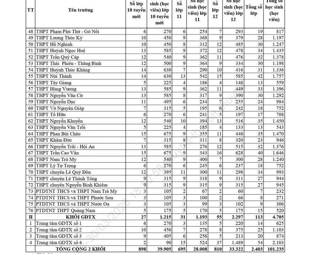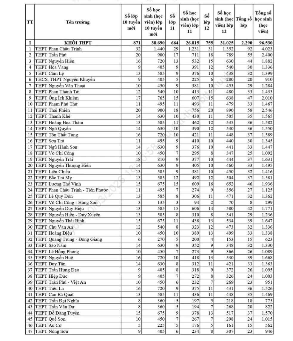 Trong số các trường THPT công lập, Trường THPT Phan Châu Trinh có chỉ tiêu tuyển sinh cao nhất với 32 lớp 10, tương ứng 1.440 học sinh. Bên cạnh đó, khối giáo dục thường xuyên với 27 lớp tuyển mới cũng được kỳ vọng góp phần mở rộng cơ hội học tập cho học sinh sau khi hoàn thành bậc THCS.