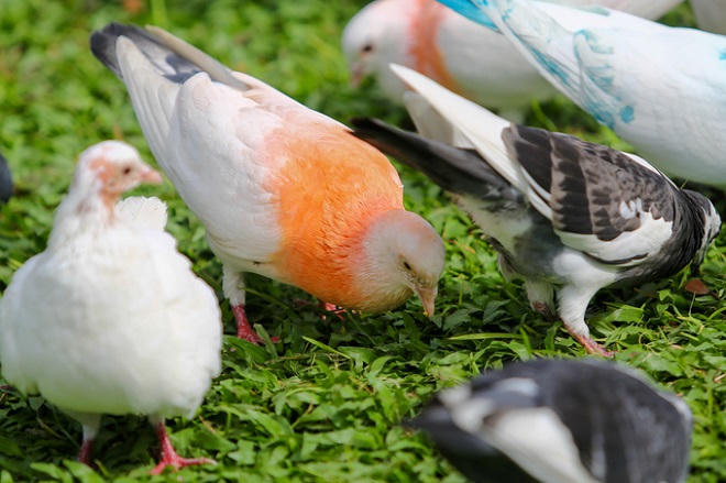 Gần một năm nay trong đàn bồ câu, có khoảng 70 con được người dân nhuộm màu sặc sỡ, bắt mắt.