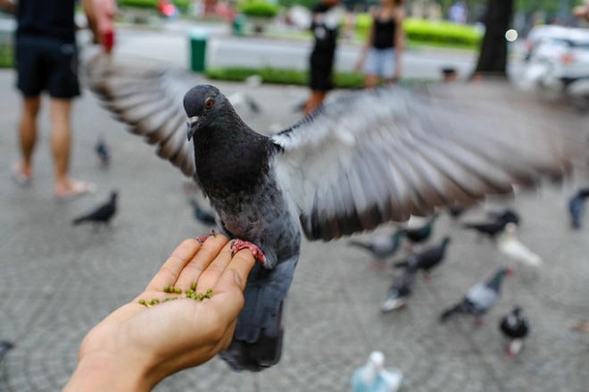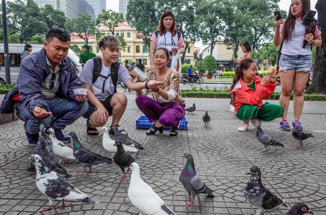 Ít ai biết, đàn chim này tồn tại là nhờ những người dân cưu mang. "Vào năm 2005, sau dịch cúm H5N1, đàn bồ câu khoảng 15 đến 20 con xuất hiện trước nhà thờ Đức Bà. Thương đàn chim, tôi và một số người dân ở đây mang thóc đãi cho chim ăn hàng ngày. Lâu ngày, đàn chim dạn dĩ với người hơn, chúng sinh sôi nảy nở lên đến hơn 700 con như hiện nay", chị Nguyễn Ngọc Quang Thanh (40 tuổi), bán nước giải khát cạnh nhà thờ, kể.
