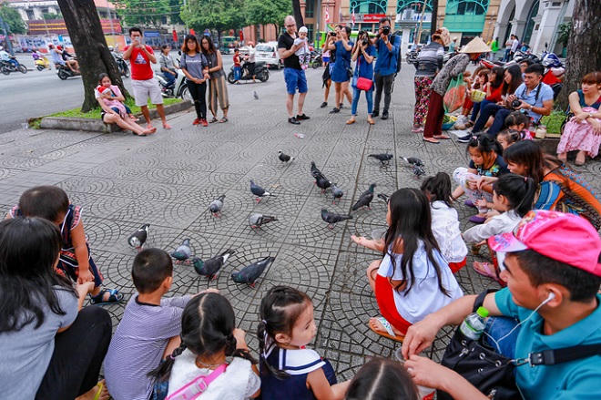 Vào dịp cuối tuần, đàn chim trở thành tâm điểm của người dân và khách tham quan. Nhiều phụ huynh đưa con em đến khu vực nhà thờ để chụp ảnh và cho đàn chim ăn.