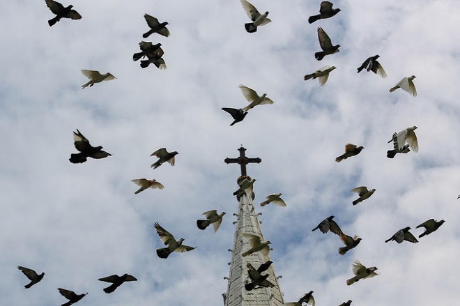 Khoảnh khắc đàn bồ câu bay quanh nhà thờ trong lúc người dân làm lễ cầu nguyện vào buổi sớm.