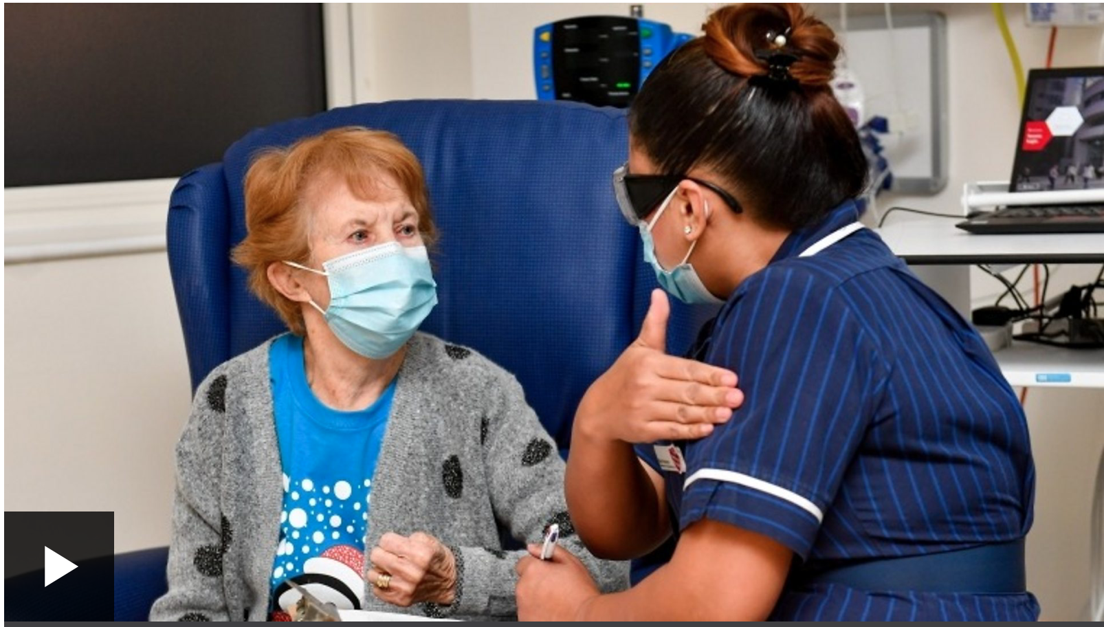 Bà Margaret Keenan – người đầu tiên được tiêm chủng tại Vương quốc Anh tại Bệnh viện Đại học ở Coventry. |