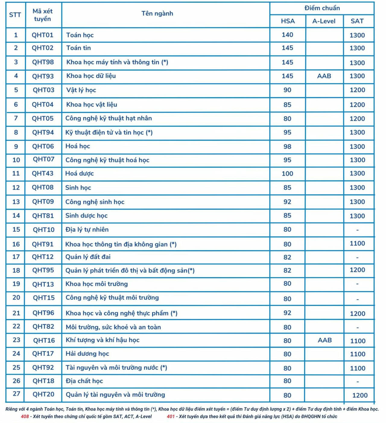 Trong đó điểm trúng tuyển thi HSA với 4 ngành Toán học, Toán tin, Khoa học máy tính và thông tin, Khoa học dữ liệu được tính như sau: Tổng điểm Tư duy định lượng (nhân hệ số 2) cộng với điểm Tư duy định tính và cộng với điểm Khoa học.