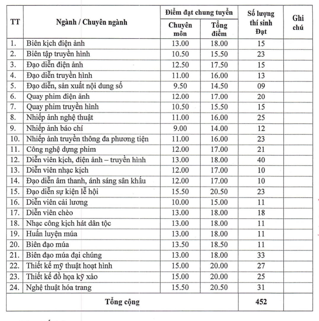 Trong 24 ngành tuyển sinh, 2 ngành lấy mức điểm chuẩn cao nhất là Đạo diễn sự kiện lễ hội và Nghệ thuật hóa trang với 20,50 điểm (tổng điểm). Ngành có điểm chuẩn thấp nhất là Nhiếp ảnh báo chí với 14 điểm.
