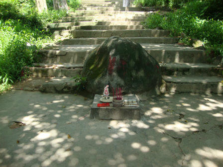 Đi lên chùa Châu Thới, ở bậc thang thứ 170 du khách bắt gặp hòn đá to, lúc nào cũng nhang khói nghi ngút nằm ngay giữa lối đi. Người dân gọi hòn đá là “ông Tà”, vị thần giữ cửa chùa.