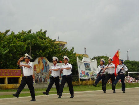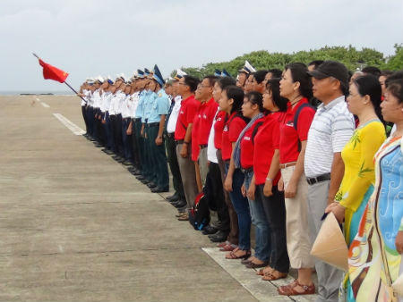 Sau phút giây hân hoan gặp gỡ, chúng tôi tiến về đường băng Trường Sa. Giọng người chỉ huy phát ra từ loa truyền thanh: “Kính mời đoàn công tác và quân, dân của đảo vào vị trí làm lễ chào cờ”. Không ai bảo ai, chúng tôi bước nhanh xếp hàng, hướng mắt về cột mốc chủ quyền. Mệnh lệnh đanh thép từ trưởng đoàn công tác: “Nghiêm…! Chào cờ…. chào!”. Khẩu lệnh vừa dứt, tổ quân kỳ đứng ở đầu hàng giương cao cờ “Đảo Trường Sa”.
