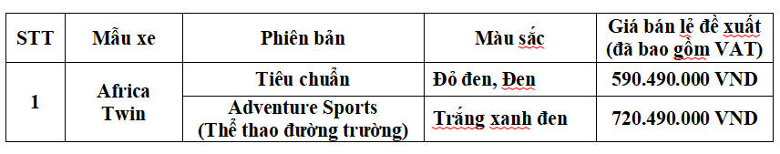 Africa Twin với hai phiên bản dự kiến sẽ được bán chính thức tại hệ thống Cửa hàng xe Phân khối lớn Honda trên toàn quốc vào ngày 15/02/2023 với chế độ bảo hành 2 năm, không giới hạn km và giá bán như sau: