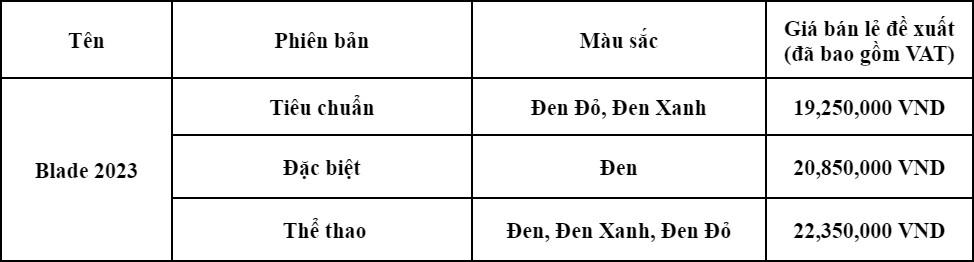 Honda Blade phiên bản 2023 sẽ được chính thức bán ra thị trường từ ngày 12/4/2023thông qua Hệ thống Cửa hàng Bán xe và Dịch vụ do Honda Ủy nhiệm (HEAD) trên toàn quốc với chế độ bảo hành 3 năm hoặc 30.000 km và giá bán lẻ đề xuất như sau: