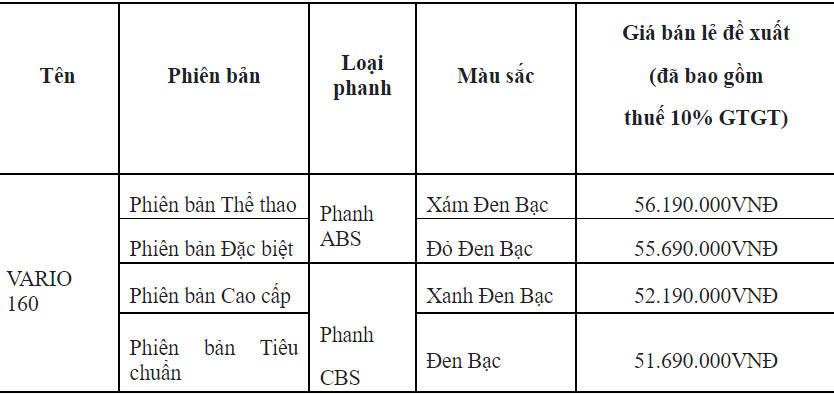 VARIO 160 và bộ phụ kiện của mẫu xe này sẽ được chính thức bán ra thị trường từ ngày 30/12/2022 thông qua các HEAD trên toàn quốc với giá bán lẻ đề xuất như sau: