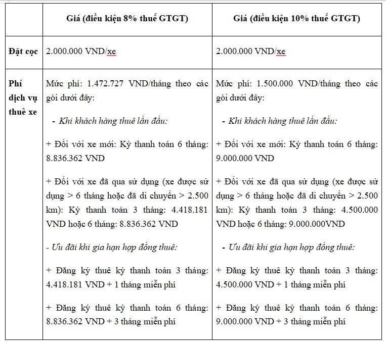 Xe dự kiến sẽ được cho thuê kèm theo 2 pin và 2 sạc tại 19HEAD ở 3 thành phố lớn là Hà Nội, TP.HCM và Đà Nẵng, với mức giá như sau: