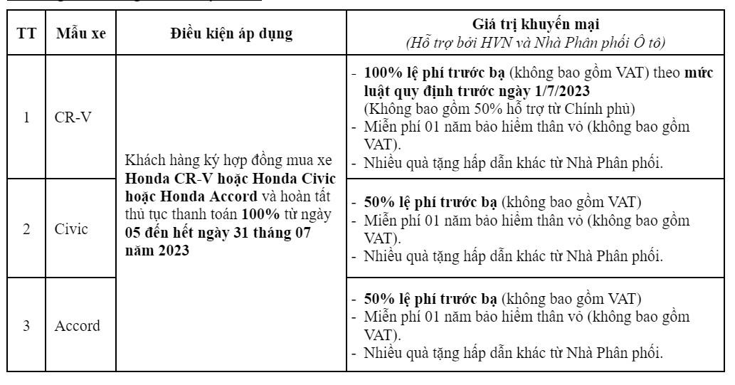 (PLVN) - Công ty Honda Việt Nam phối hợp cùng các Nhà Phân phối Ô tô triển khai chương trình khuyến mại từ ngày 05 đến hết ngày 31 /07/2023: