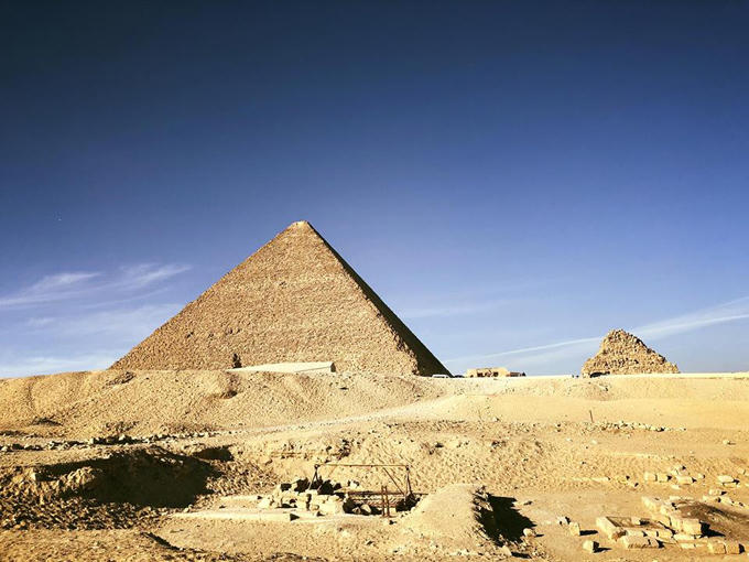 "Đến chiêm ngưỡng quần thể Kim tự tháp Gizah cách thủ đô Cairo 30 phút đi taxi, bạn sẽ ngỡ ngàng đến kinh ngạc bởi trí tuệ của người Ai Cập cổ xưa. Thuở ban đầu đại Kim tự tháp Gizah được phủ bên ngoài một lớp đá vôi trắng, đến năm 1303 sau công nguyên một trận động đất kinh hoàng đã làm bong tróc lớp đá vôi đó, đến nay nó chỉ còn một mảng nhỏ phủ ở chóp. Dưới nắng chiều khi mặt trời rọi vào, công trình hệt như một thỏi vàng ròng, nếu lớp đá vôi trắng bao quanh vẫn còn thì hình ảnh của nó dưới nắng sẽ lấp lánh như một viên kim cương khổng lồ nằm giữa sa mạc", Hồng Ánh chia sẻ.