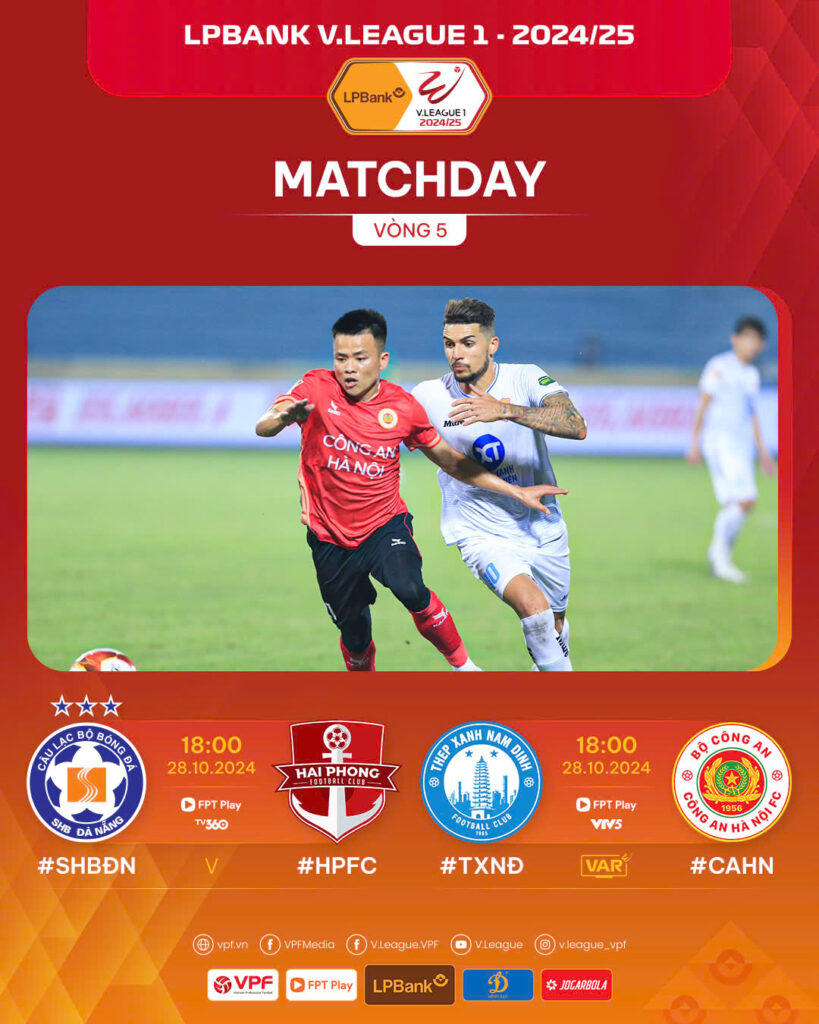 Ngày hôm nay (28/10), hai trận đấu cuối của vòng 5 V.League 2024/25 sẽ diễn ra: CLB Thép Xanh Nam Định gặp CLB Công An Hà Nội (18h00, sân Thiên Trường); CLB SHB Đà Nẵng vs CLB Hải Phòng (18h00, sân Hòa Xuân).