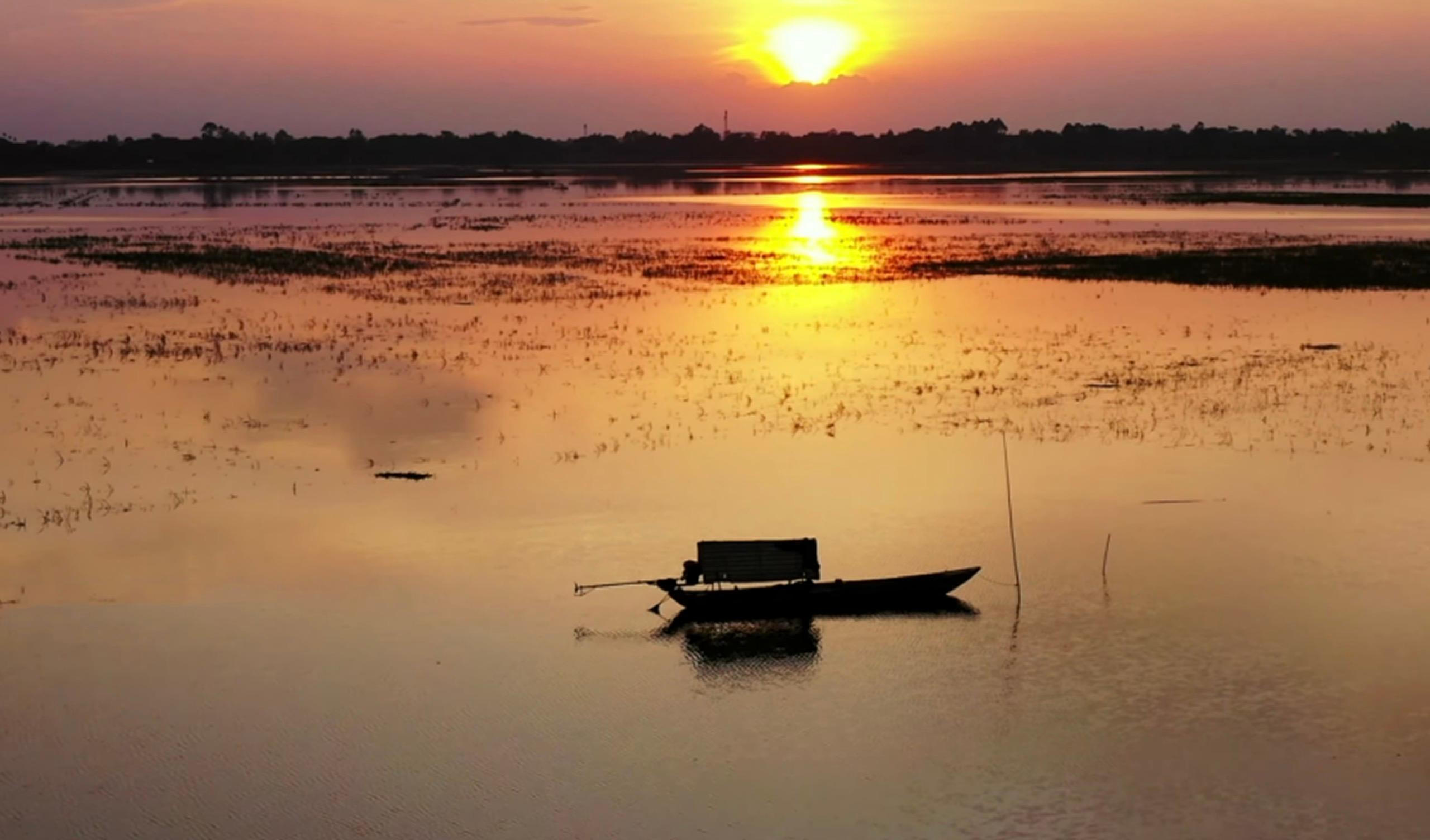 Khi hoàng hôn buông xuống, ta sẽ được dịp chiêm ngưỡng cảnh sắc rực rỡ, lộng lẫy của bầu trời. Phía bên kia bờ, những tia nắng cuối ngày đang thấp thoáng, khẽ khuất dần sau những rặng cây, để lại những quầng sáng soi chiếu những sắc màu cam đỏ. Cả vùng đầm nước lại được khoác lên chiếc áo độc đáo đầy màu sắc, ẩn sau làn mây trắng làm nổi bật lên những tia sáng rực rỡ của mặt trời còn sót lại.