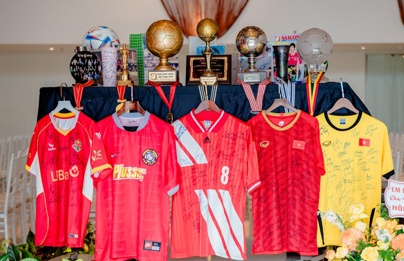 Các danh hiệu và áo đấu của danh thủ Hồng Sơn được trưng bày tại buổi ra mắt hồi ký. Ảnh: BTC |