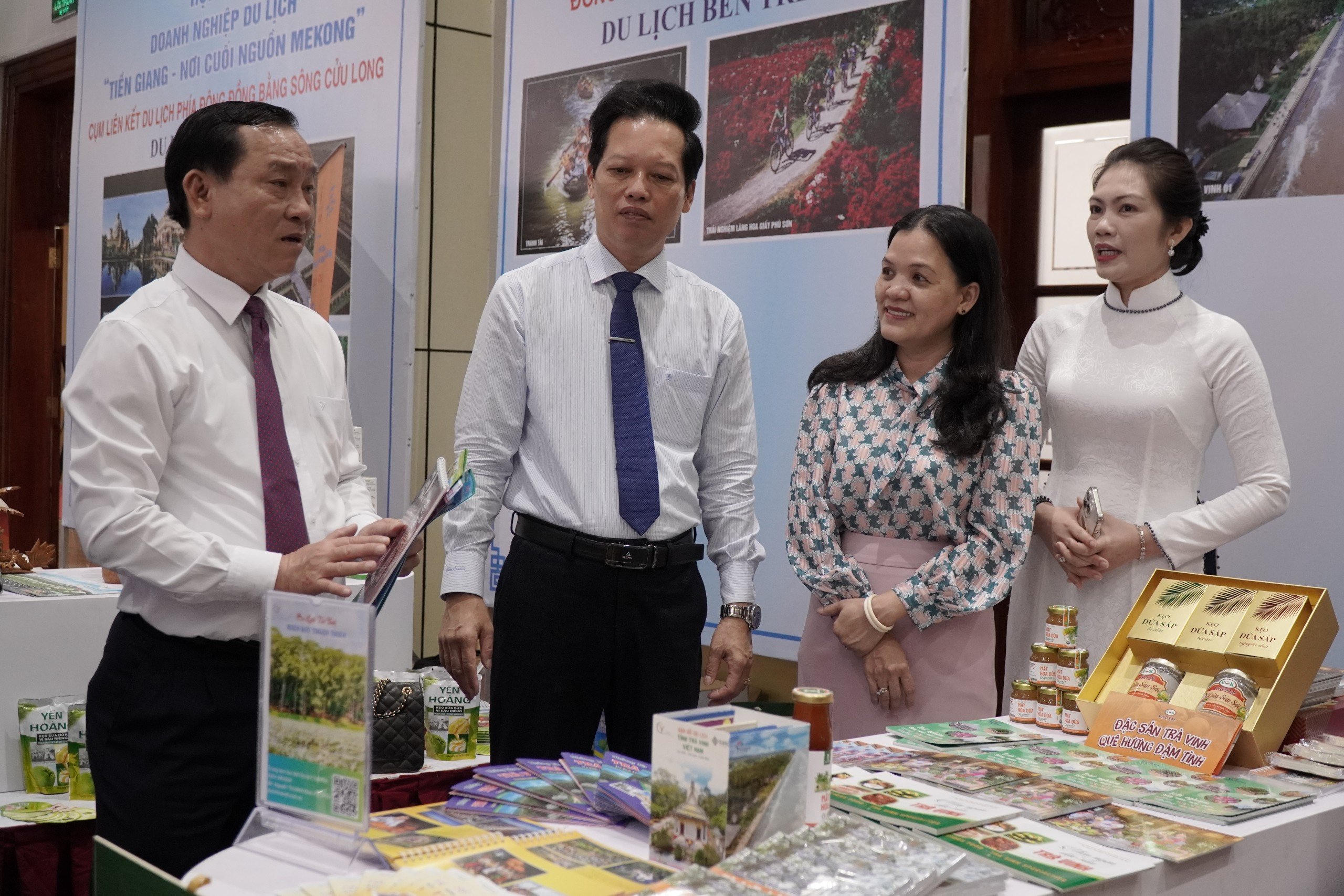 Lãnh đạo tỉnh Tiền Giang tham quan các gian hàng trưng bày sản phẩm du lịch. |
