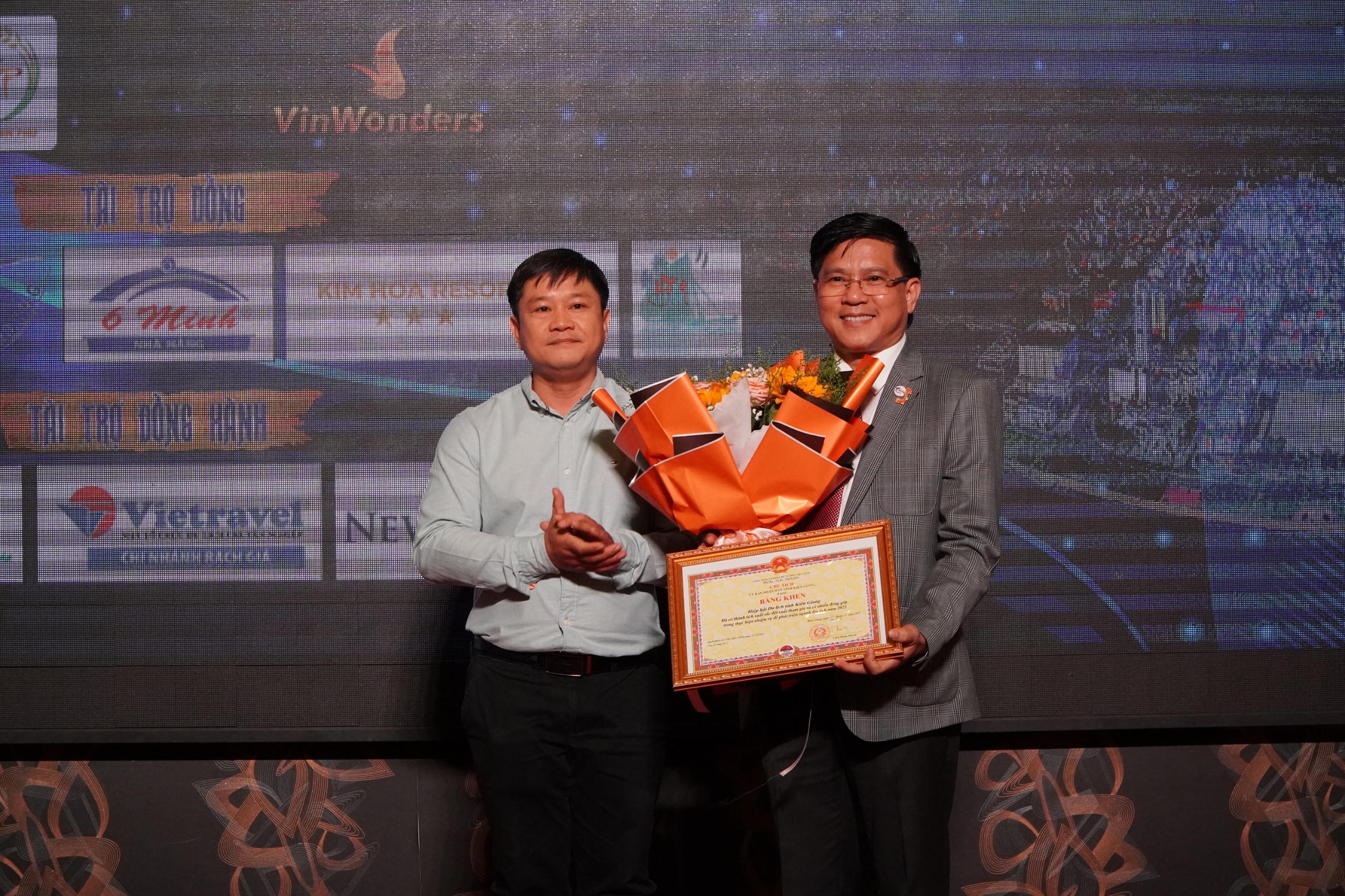 Ông Nguyễn Chí Thanh - Phó Giám đốc Sở Du lịch tỉnh Kiên Giang tặng bằng khen của Chủ tịch UBND tỉnh Kiên Giang cho Hiệp hội Du lịch tỉnh Kiên Giang. |