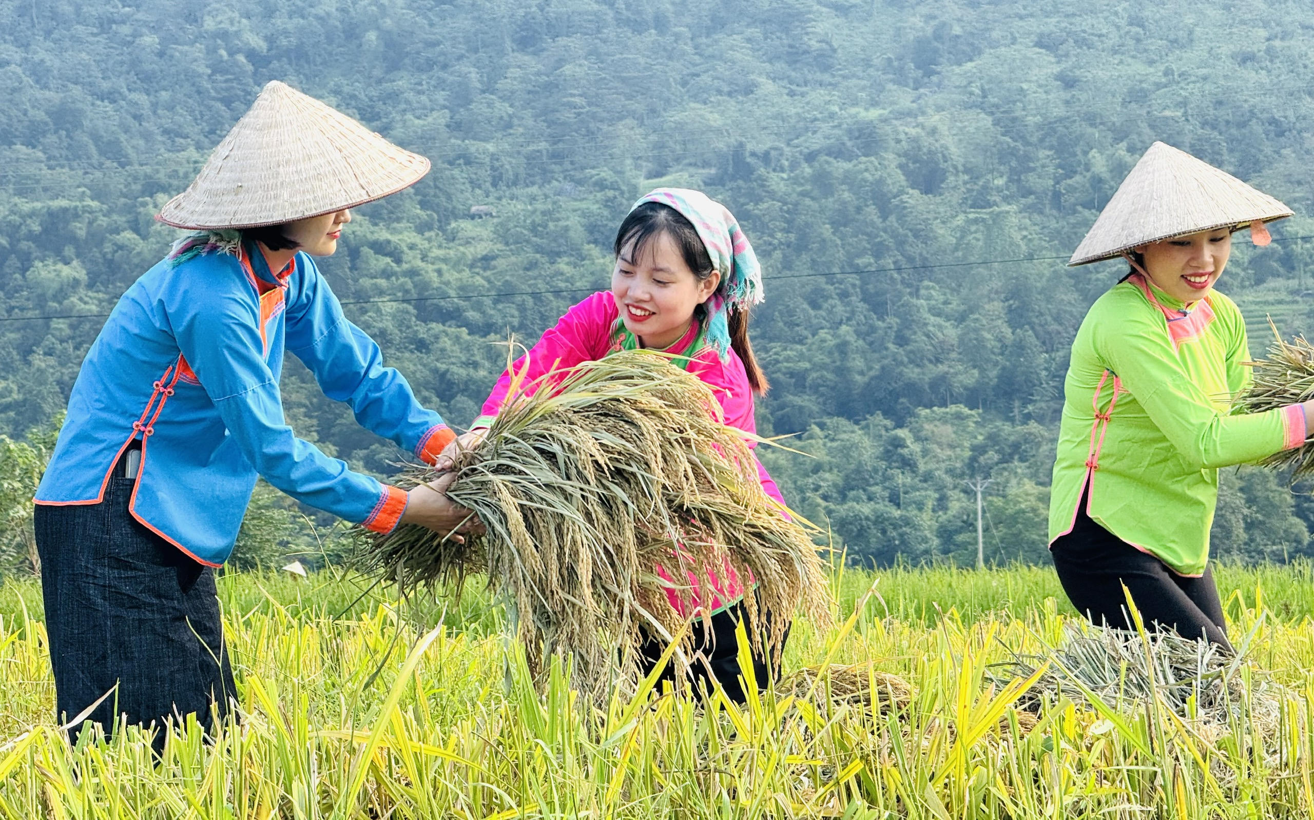 Các cô gái người Tày, Giáy, Xá Phó nơi đây đang bận rộn thu hoạch lúa. |