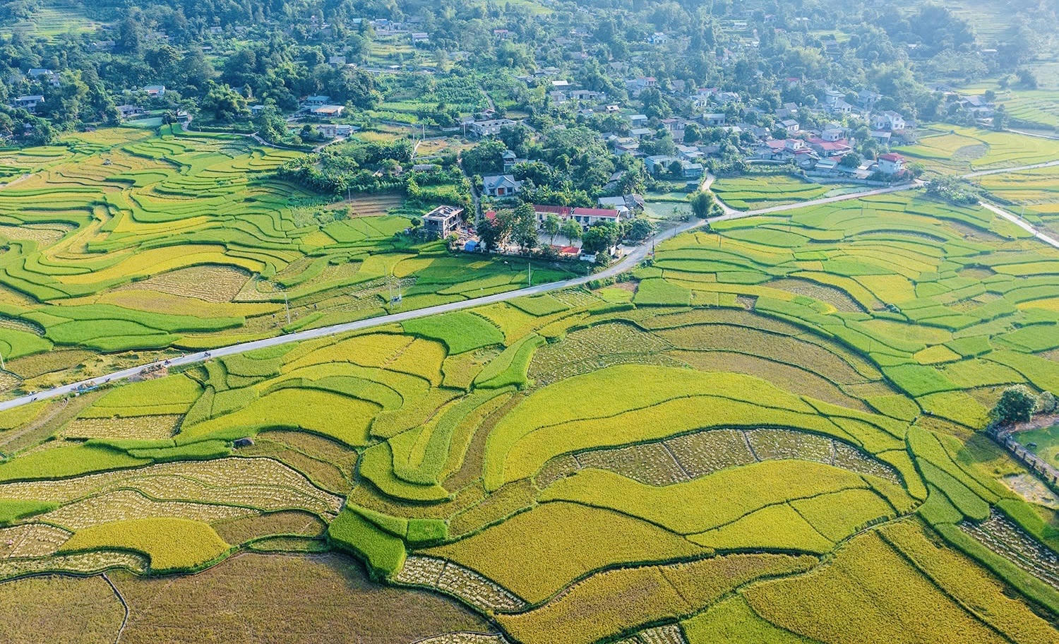 Những cánh đồng lúa chín trải dài bất tận như một tấm thảm nhiều màu sắc khổng lồ. |
