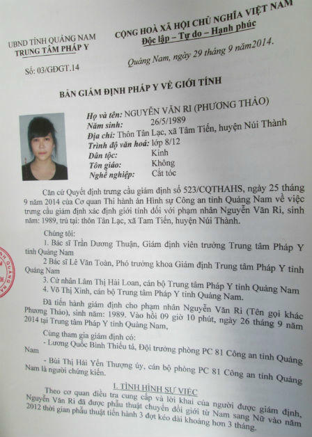 Sau khi được đại diện các ngành chức năng kiểm tra, thăm khám, đầu tháng 10/2014, Trung tâm Pháp y tỉnh Quảng Nam công bố kết luận, nêu rõ, qua quá trình khám lâm sàng và kết luận cận lâm sàng xác định Ri với lý lịch như trên là nữ giới (đã chuyển giới tính hoàn toàn sang nữ).