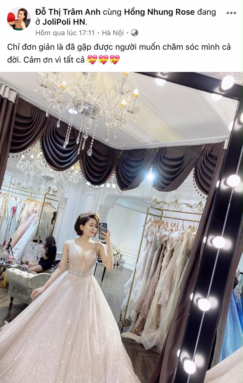 Cụ thể, Trâm Anh bất ngờ đăng tải ảnh thử váy cưới lên trang cá nhân và cho biết: “Chỉ đơn giản là đã gặp được người muốn chăm sóc mình cả đời. Cảm ơn vì tất cả”.