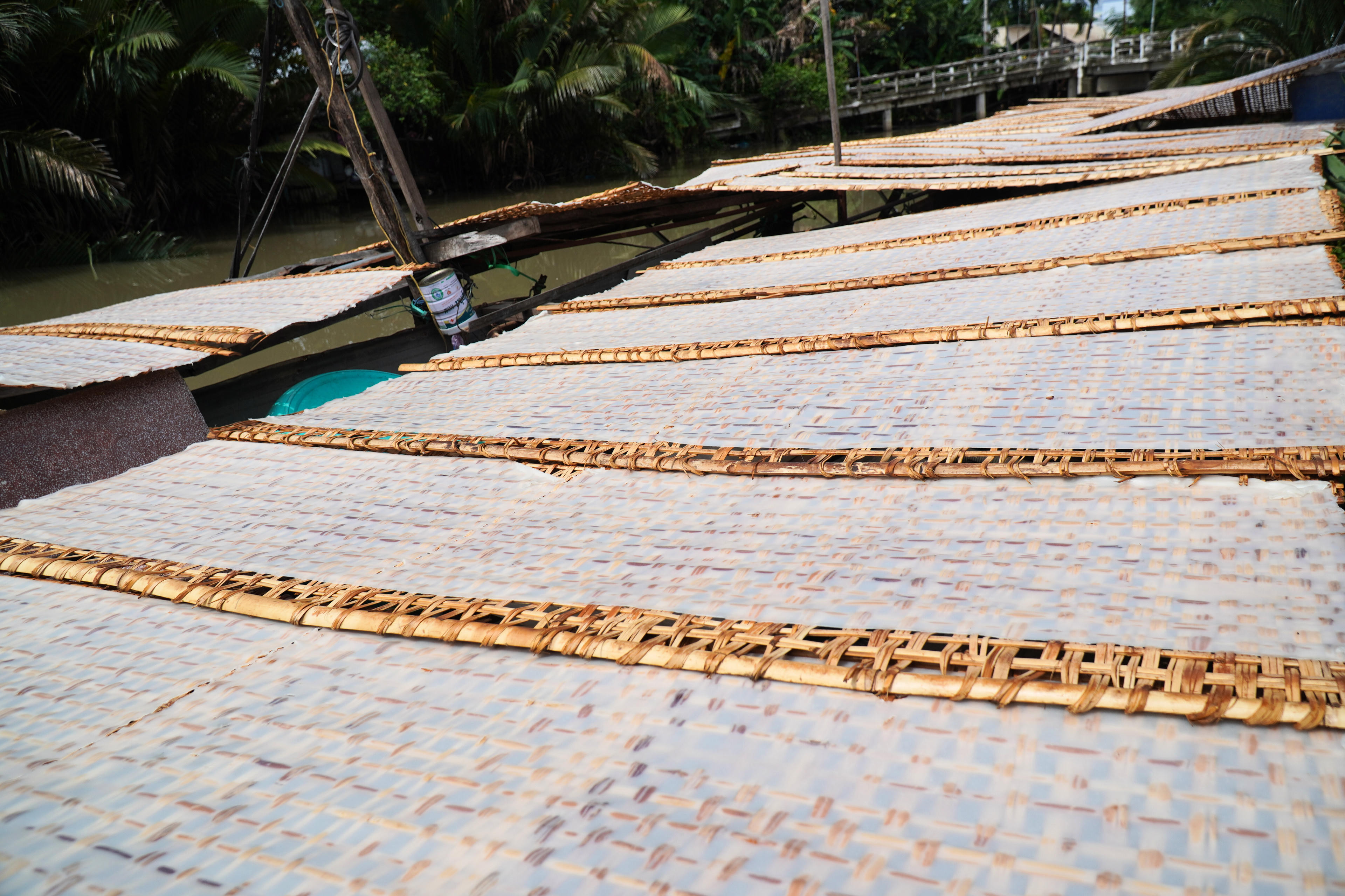 Phơi bánh hủ tiếu tại cơ sở sản xuất bánh hủ tiếu Ba Thuận. Ảnh: Anh Như |