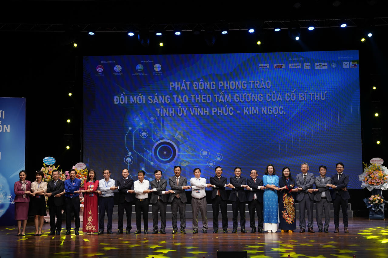 Các vị lãnh đạo cùng bắt tay nhau phát động phong trào Đổi mới sáng tạo. |